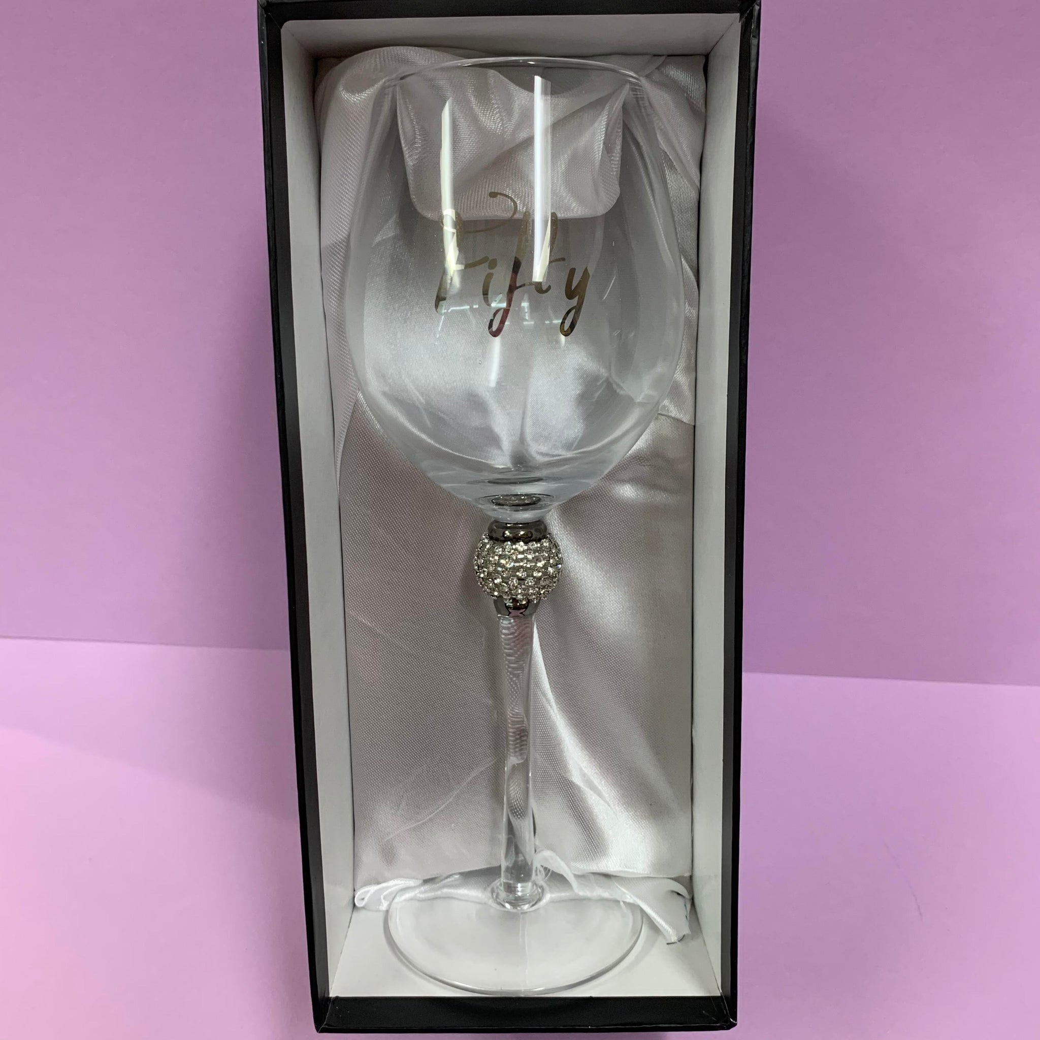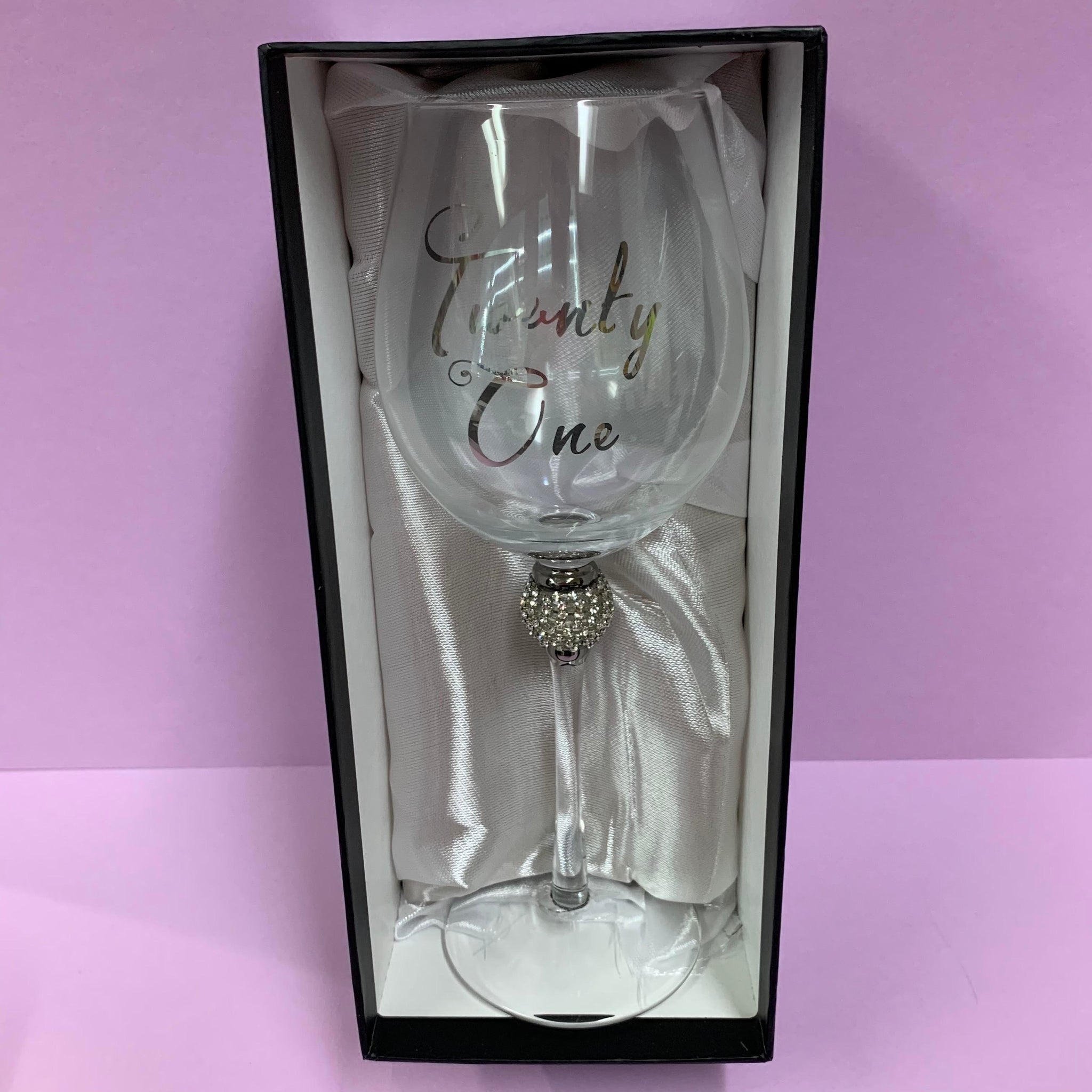 Birthday wine glass with diamante encrusted stem and silver coloured font.